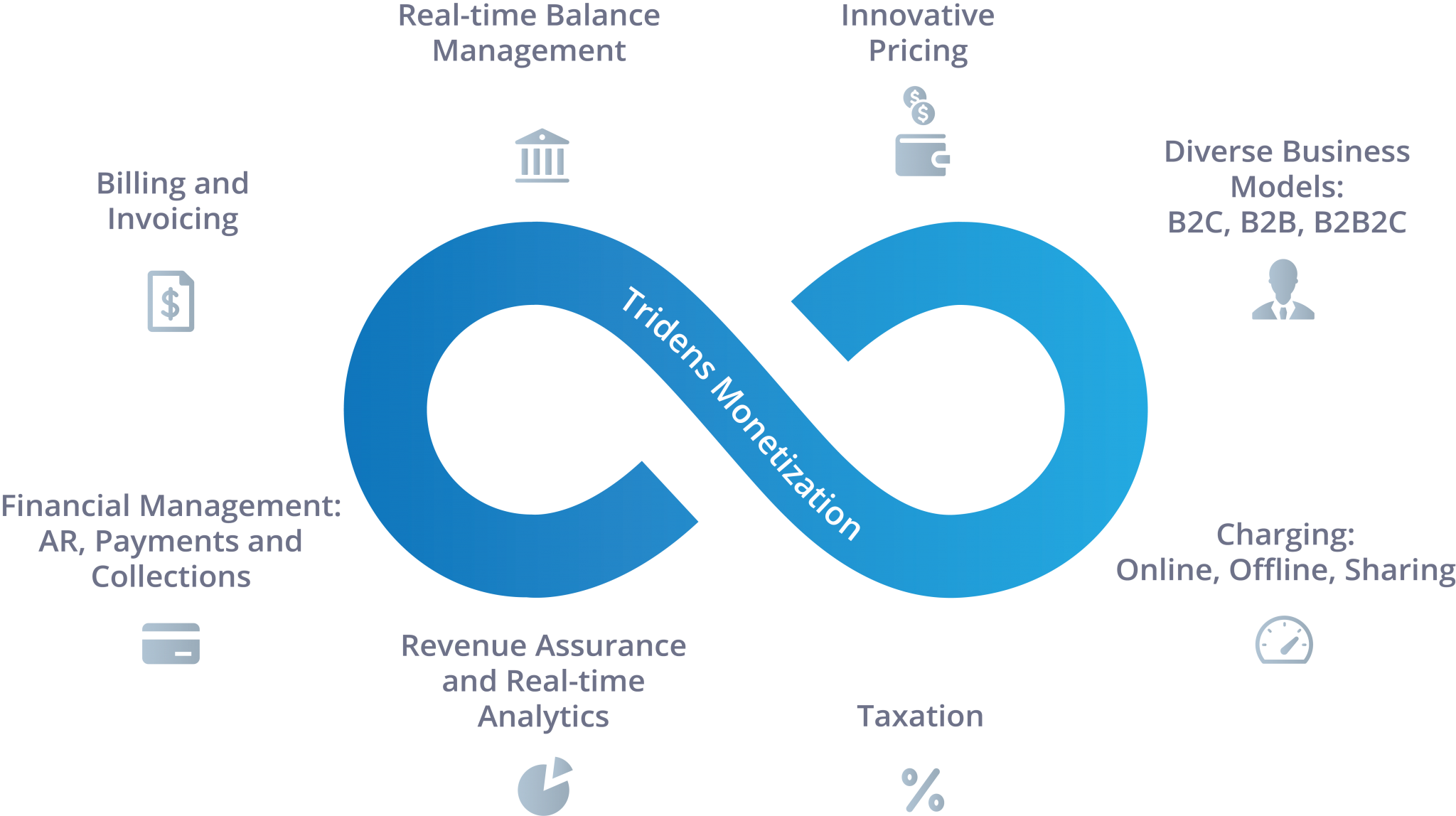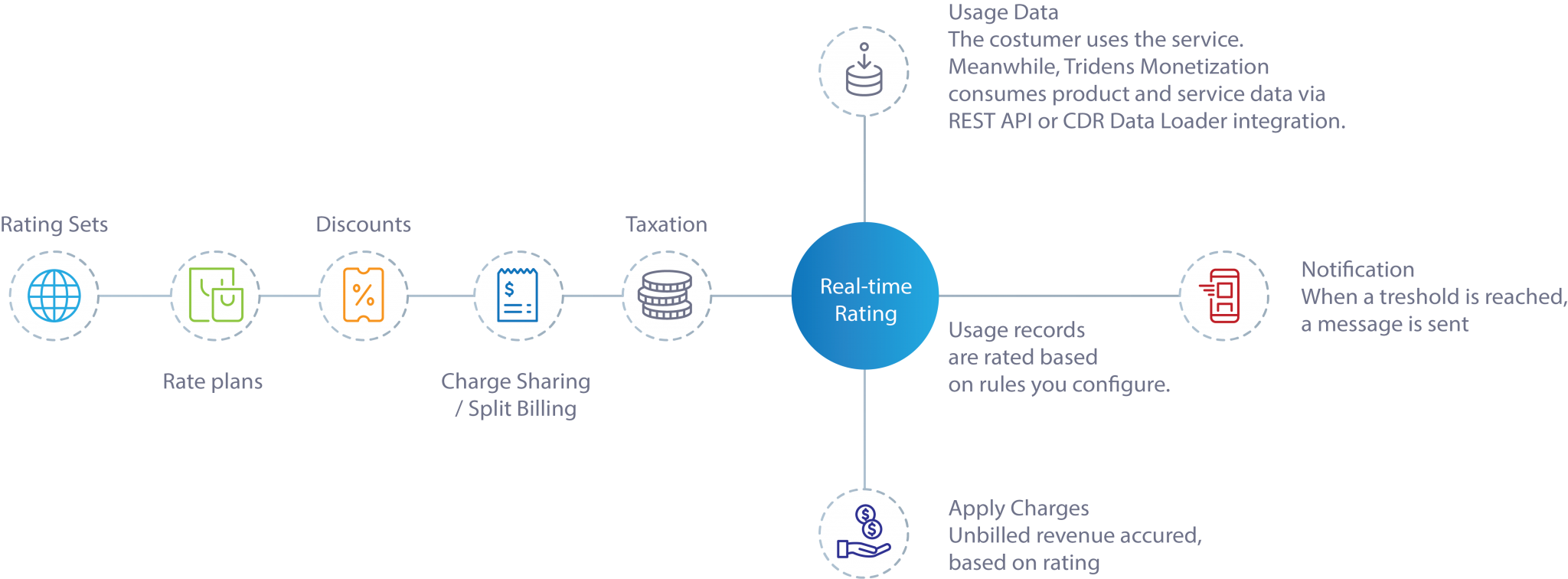 Tridens Monetization ofrece una facturación completa de presupuesto-pedido-cobro que puede gestionar sus necesidades de gestión de clientes, tarificación en línea, facturación, cálculo de impuestos, gestión de ingresos, informes y análisis, y seguimiento, entre otras. Estaríamos más que dispuestos a ayudarle a irrumpir en el mercado. Contamos con una plataforma de facturación en la nube basada en el uso que resulta ideal tanto para proveedores de servicios IoT como para proveedores de servicios basados en suscripciones que buscan ampliar sus procesos de cotización-pedido-cobro. No es una cuestión de si, es una cuestión de cuándo. Entonces, ¿cuándo puede Tridens Monetization ¡eleve su negocio al siguiente nivel?!