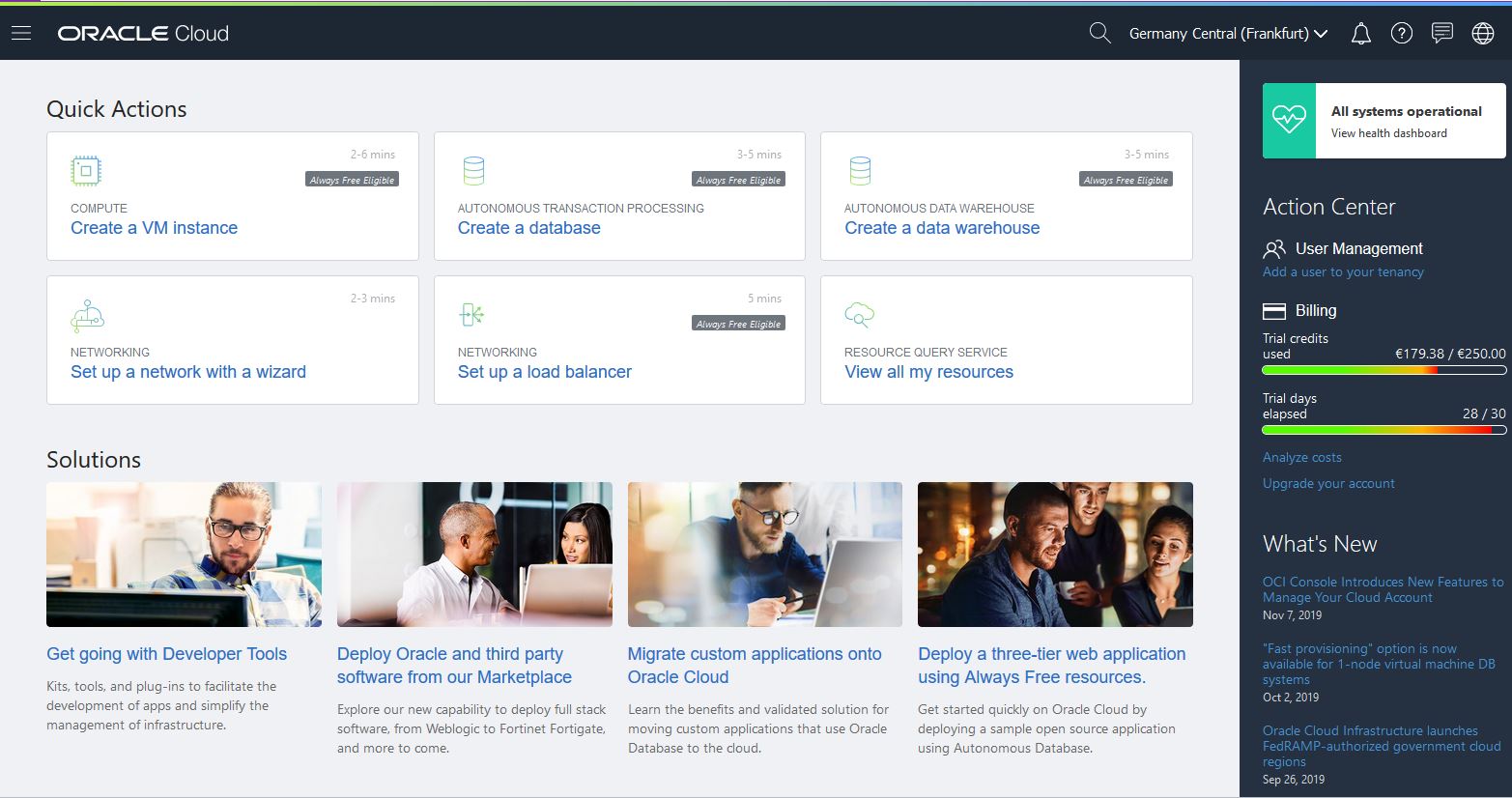 Oracle Corporation is offering its cloud computing service (Oracle Cloud) that provides services, storage, servers, etc. through a global network of managed data centers. You can choose which managed data center you want to use when setting up your cloud environment. Usually, you want to select one which is geographically close to you. Some basic features of Oracle Cloud (like some essential instances of Autonomous Database and Virtual Machine – with limitations) are in a free tier of Oracle Cloud (named “Always Free Eligible”) and can be used for free for an unlimited time. You can also take advantage of a 30-day free trial, and in that timeframe, you can test out more advanced features and possibilities that Oracle Cloud is offering to you. Your account can always be upgraded to a paid version. Oracle Cloud provides a handy cost estimation calculator where you can set up your infrastructure and services that you want to use, and the calculator returns you cost estimations for your chosen set up.