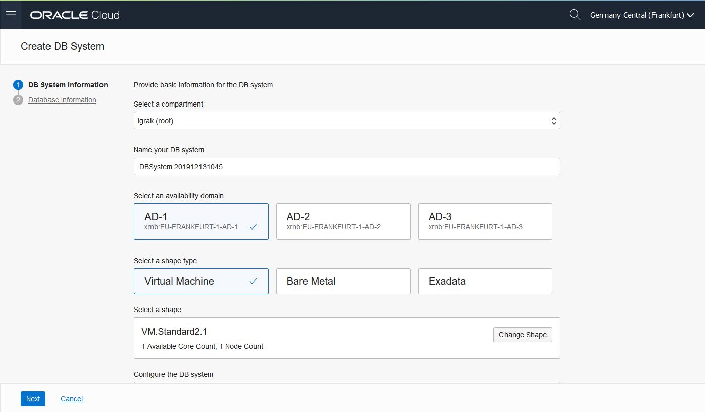 You must choose a name for your DB system and select on which availability domain in your chosen managed data center do you want to run it. Choose the “Virtual Machine” shape type and some basic shape for your database (it will suffice for our testing purposes). Choose “Enterprise Edition High Performance” as your Database software edition. Note that if you choose “Enterprise Edition,” then your database instance will not support partitioning, and your BRM deployment will fail as a consequence. You can then also tune some other instance parameters and upload your SSH public key for access. On the next page, you can configure some more options and define administrator credentials for your database instance (they are essential, remember them). Now you can confirm your settings and DB System will be created.