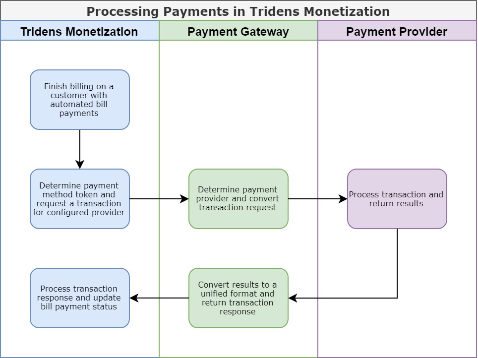 A Payment gateway included seamlessly into a billing and rating engine can be a very powerful feature since processing payments closes the final gap in the order-to-cash flow. Utilizing a payment gateway is the approach we decided to take when supporting payment collection in Tridens Monetization, and we achieved that by designing our own Tridens Payment Gateway.