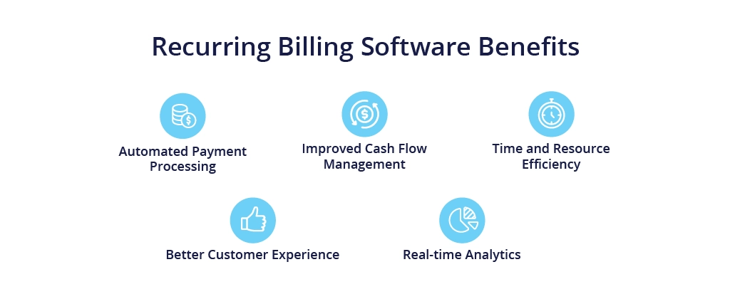 - The biggest benefits of recurring billing software include automated payment processing, improved cash flow management, better customer experience, time and resource efficiency, and access to real-time analytics.