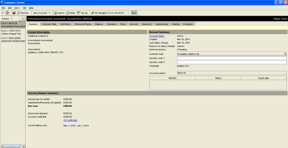 Picture 1. Oracle BRM 7.5 PS22 Customer Center anonymized customer data